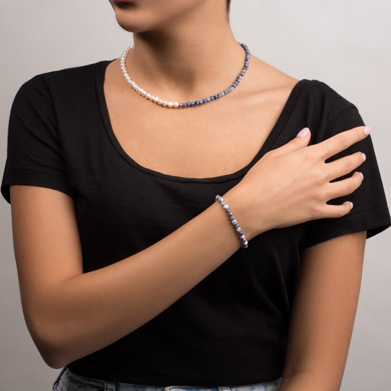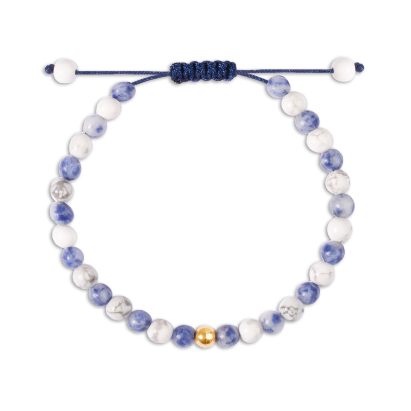 دستبند طلا گوی بارین با ترکیبی از دو نوع سنگ هالوییت و سودالیت مناسب برای درخشش بیشتر استایل شما.