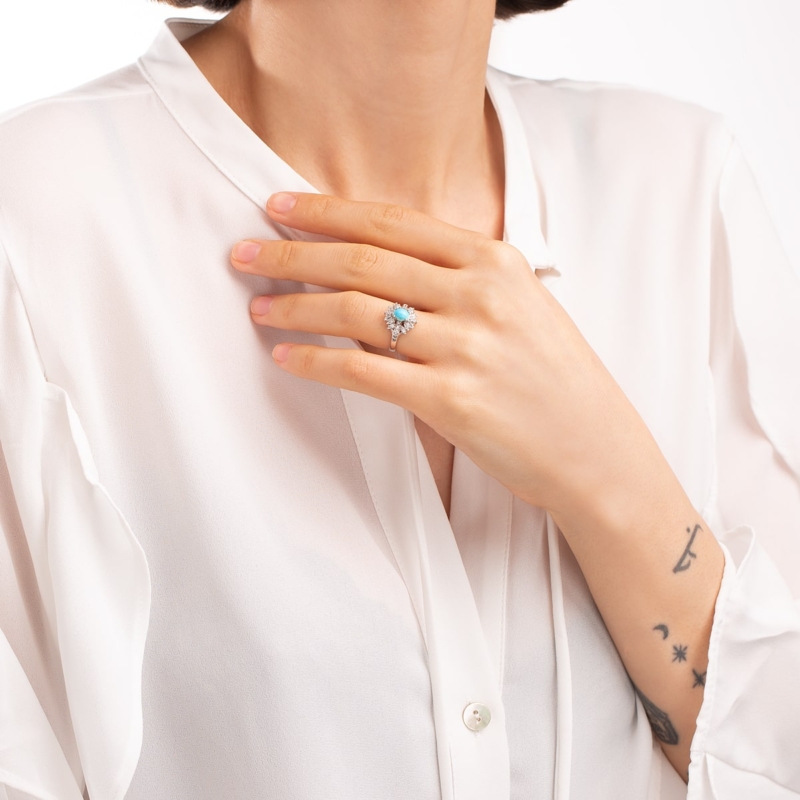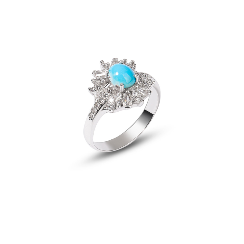 انگشتر نقره فیروزه ماه، ساخته شده از نقره عیار 925 همراه با آبکاری طلا و کاملا دست ساز می باشد.