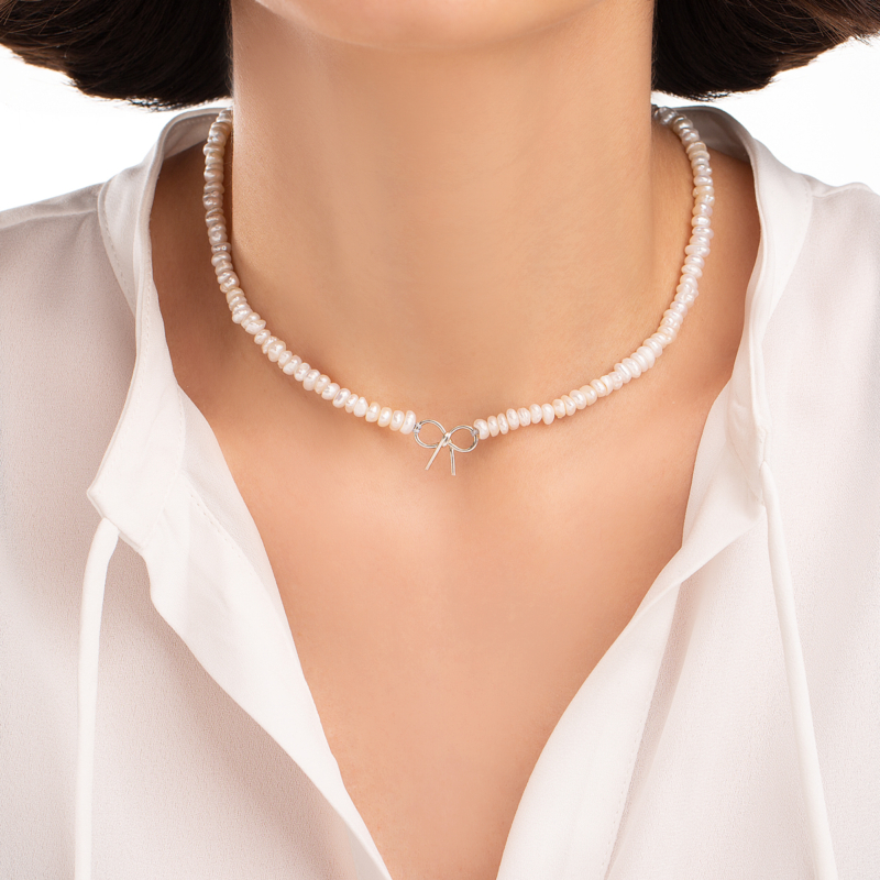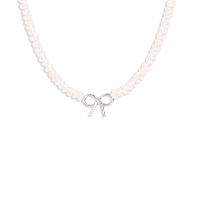 گردنبند نقره پاپیون با بند مروارید، ساخته شده از نقره عیار 925 و کاملا دست ساز می باشد.