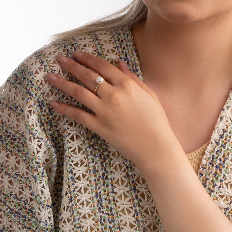 انگشتر طلا پیچ و مروارید، ساخته شده از طلا 18 عیار و کاملا دست ساز می باشد.