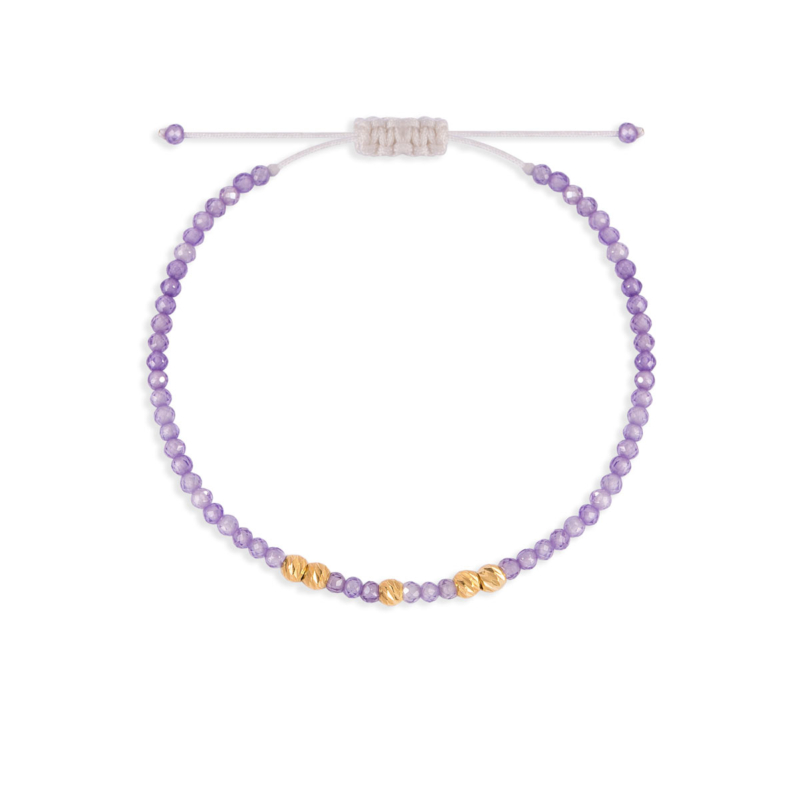 دستبند طلا گوی تراش دار و سنگ بنفش، ساخته شده از5 گوی طلا 18 عیار و کاملا دست ساز می باشد.