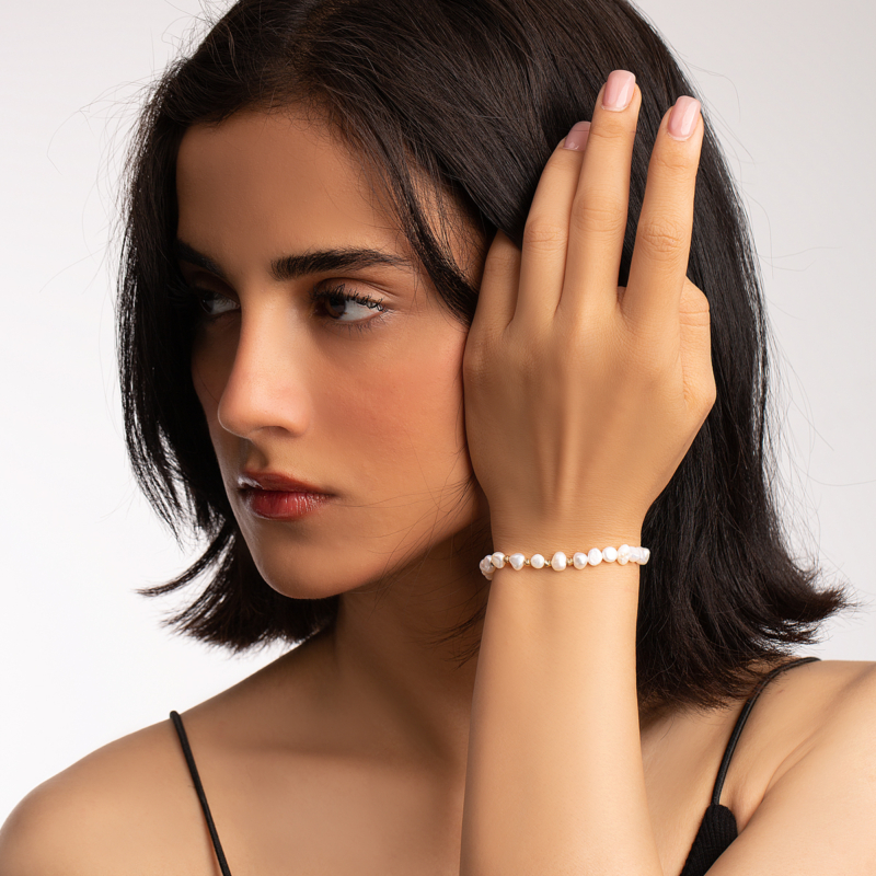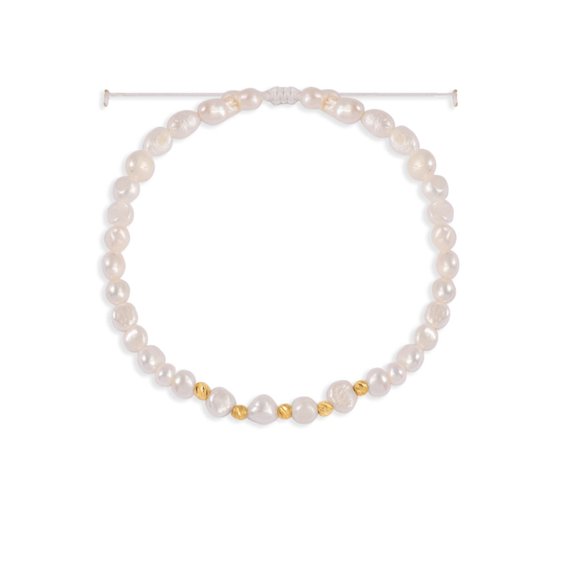 دستبند طلا و مروارید باروک ریز، ساخته شده از 5 گوی طلا 18 عیار و کاملا دست ساز می باشد.
