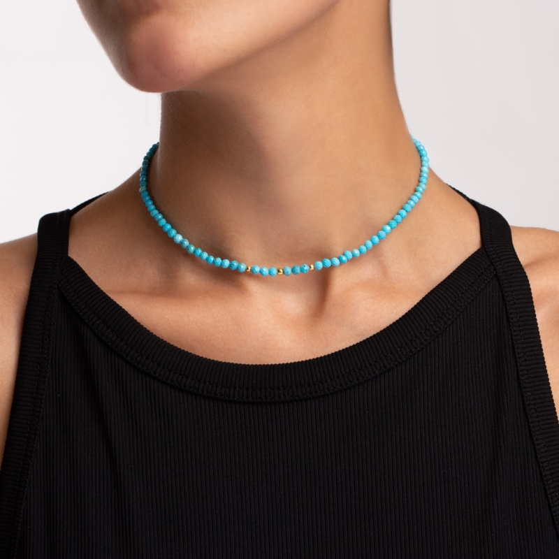 گردنبند طلا فیروزه، ساخته شده از طلا 18 عیار و کاملا دست ساز می باشد.