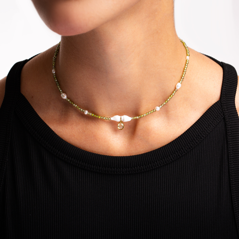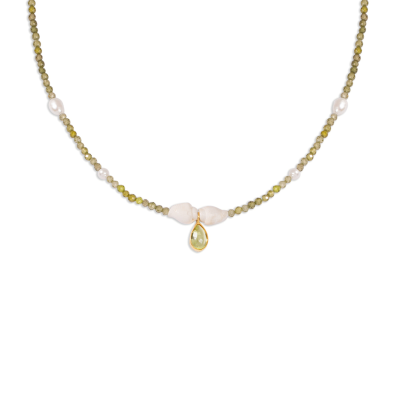 گردنبند طلا مرواریدی اشک سبز زیتونی، ساخته شده از طلا 18 عیار و کاملا دست ساز می باشد.