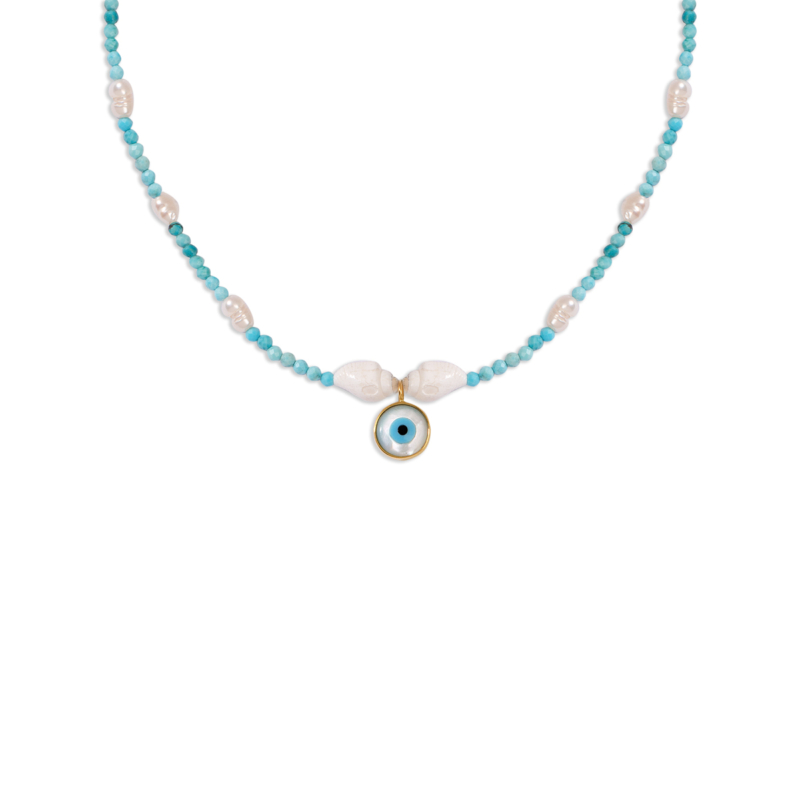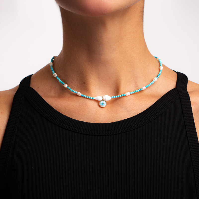 گردنبند طلا سنگی چشم نظر دایره درشت، ساخته شده از طلا 18 عیار و کاملا دست ساز می باشد.