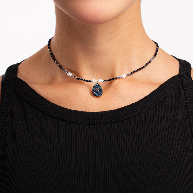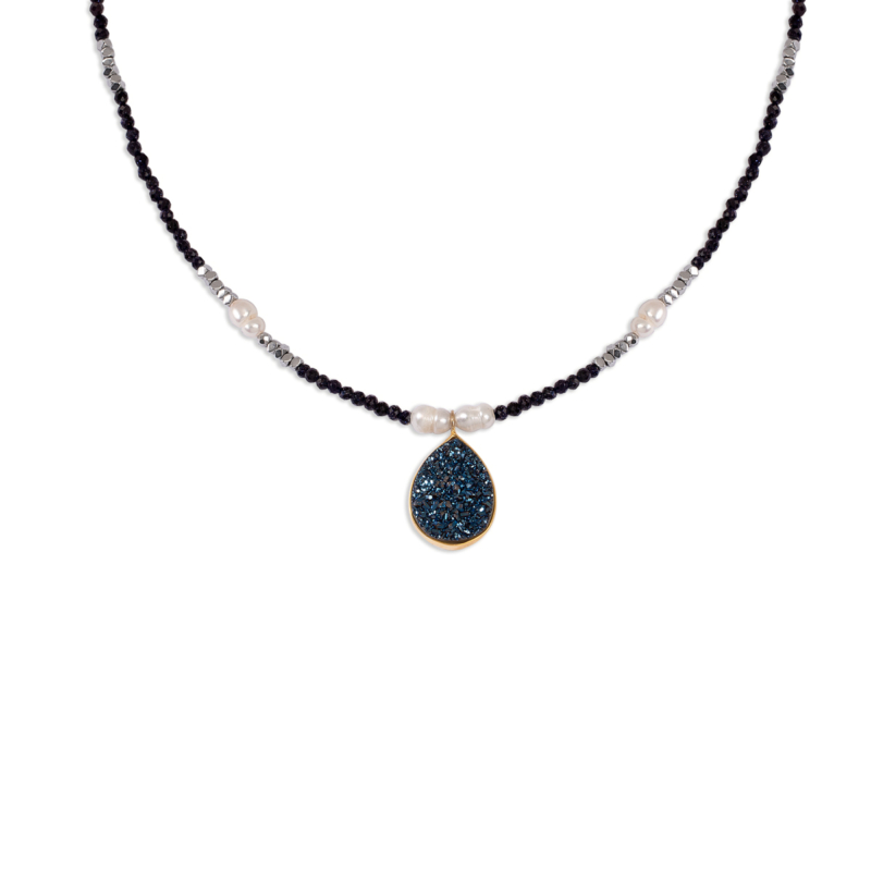 گردنبند طلا اشک سرمه ای کوارتز، ساخته شده از طلا 18 عیار و کاملا دست ساز می باشد.