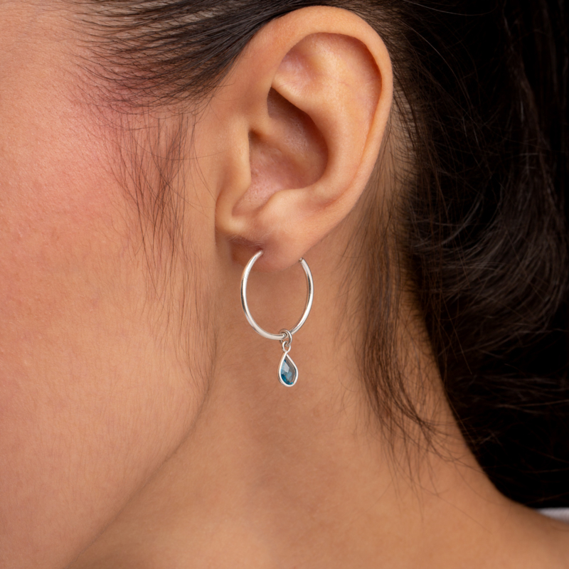 گوشواره حلقه ای نقره و سنگ آکوامارین اشک،ساخته شده از نقره عیار 925 و کاملا دست ساز می باشد.