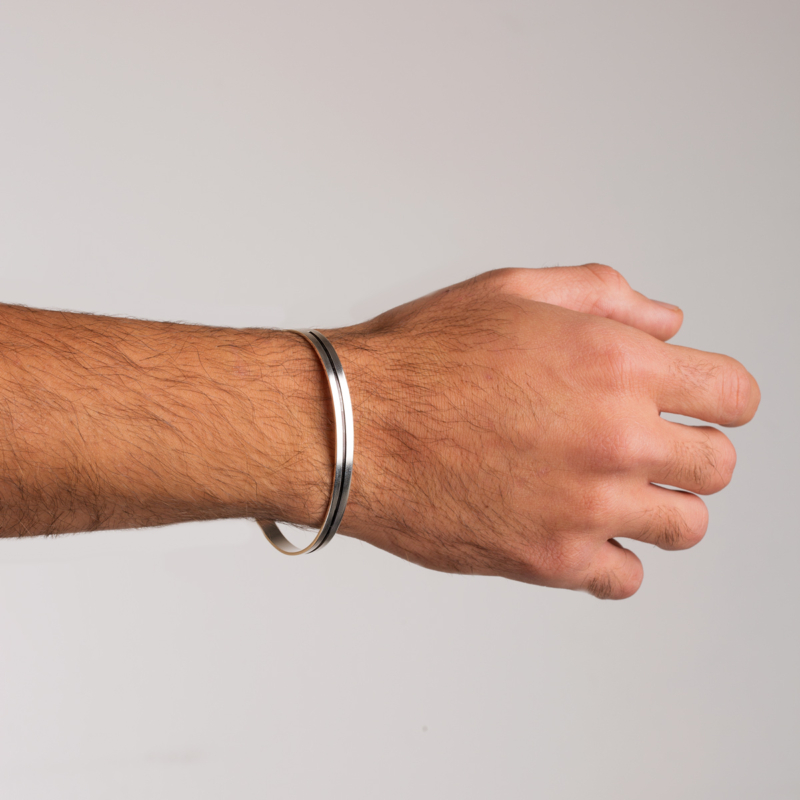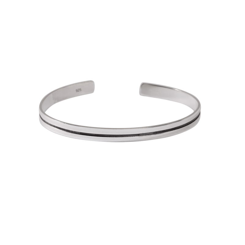 بنگل نقره تخت مردانه خط ، ساخته شده از نقره عیار 925 و کاملا دست ساز می باشد.