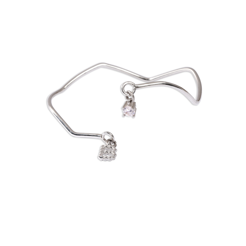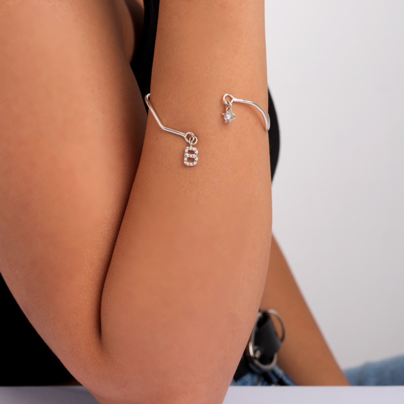 بنگل نقره دفرمه حرف انگلیسی و نگین آویز ، ساخته شده از نقره عیار 925 و کاملا دست ساز می باشد.