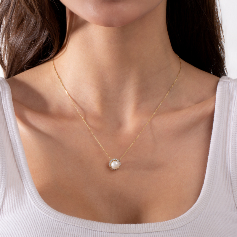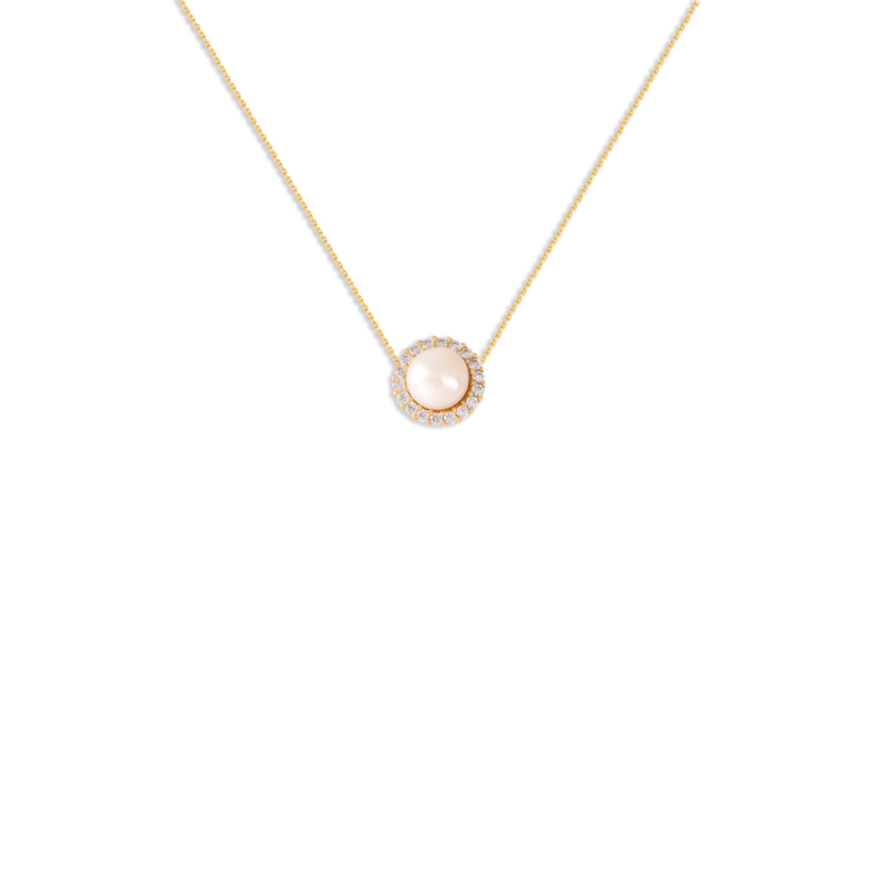 گردنبند طلا مروارید دور نگین،ساخته شده از طلا 18 عیار و کاملا کار دست می باشد.